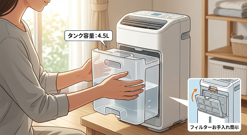 除湿機は購入後に日常的に使う家電なので、タンク容量やお手入れのしやすさも確認しておきたいポイントです。タンクが小さいと、こまめに水を捨てる必要があり、手間に感じることがあります。