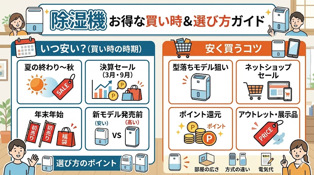 除湿機は、梅雨前や梅雨の最中のような需要が高まる時期よりも、夏の終わりから秋にかけてや決算セール、年末年始セール、新モデル発売前後に安くなりやすい傾向があります。