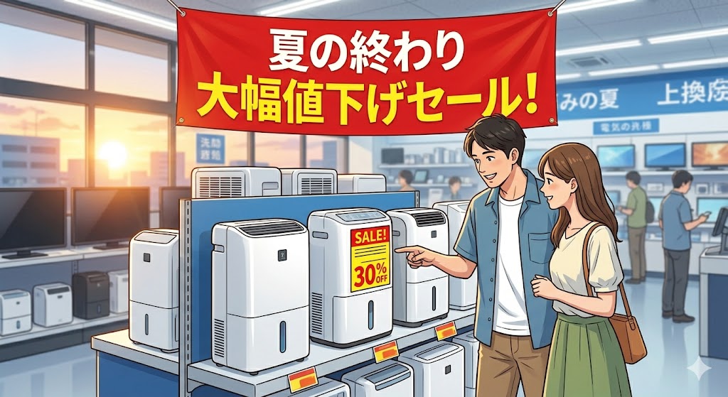 除湿機が安くなりやすい代表的な時期が、夏の終わりから秋にかけてです。梅雨から夏にかけて活躍する家電なので、そのシーズンが終わる頃には需要が落ち着き、価格も下がりやすくなります。特に夏向けのモデル(コンプレッサー式)は、秋に大幅に値下がりやすいです。