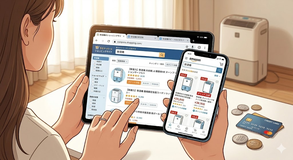 除湿機を安く買うときは、本体価格だけで判断しないことも大切です。家電量販店やネットショップでは、ポイント還元を含めると実質的にお得になる場合があります。