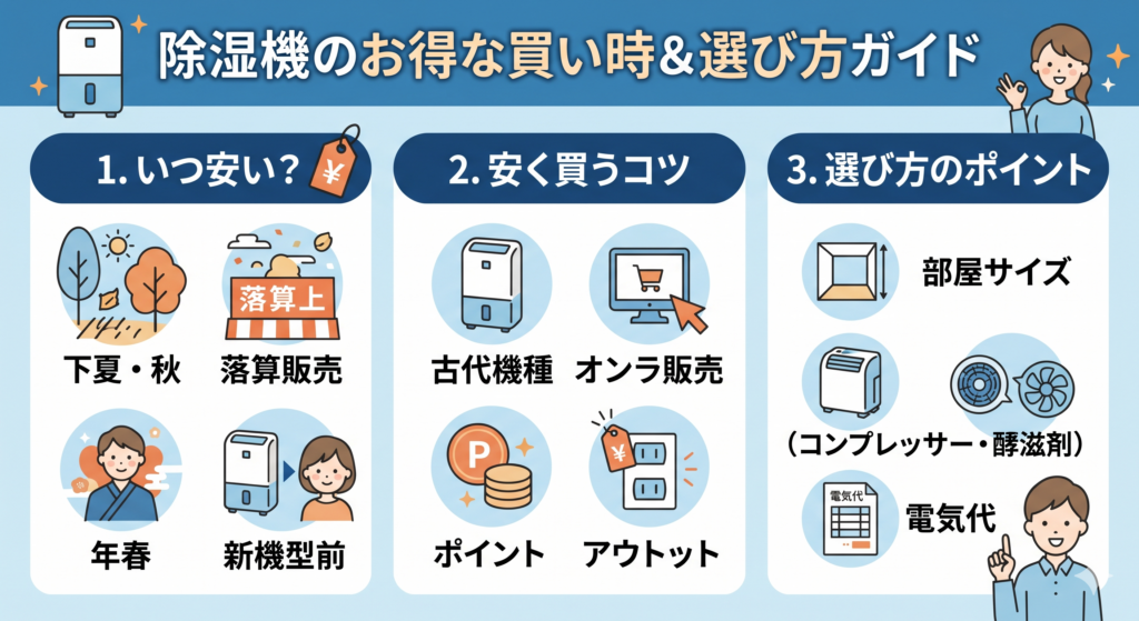 除湿機を買うベストなタイミングは、必要になる少し前です。もっとも安さを重視するなら、夏の終わりから秋、または大型セール時期を狙うのが理想です。