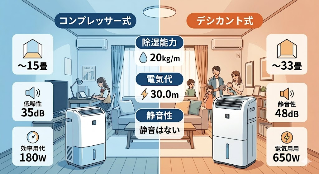 除湿機には主にコンプレッサー式とデシカント式があり、それぞれ特徴が異なります。安さだけで決めると、使う季節や目的に合わず、後悔することがあります。